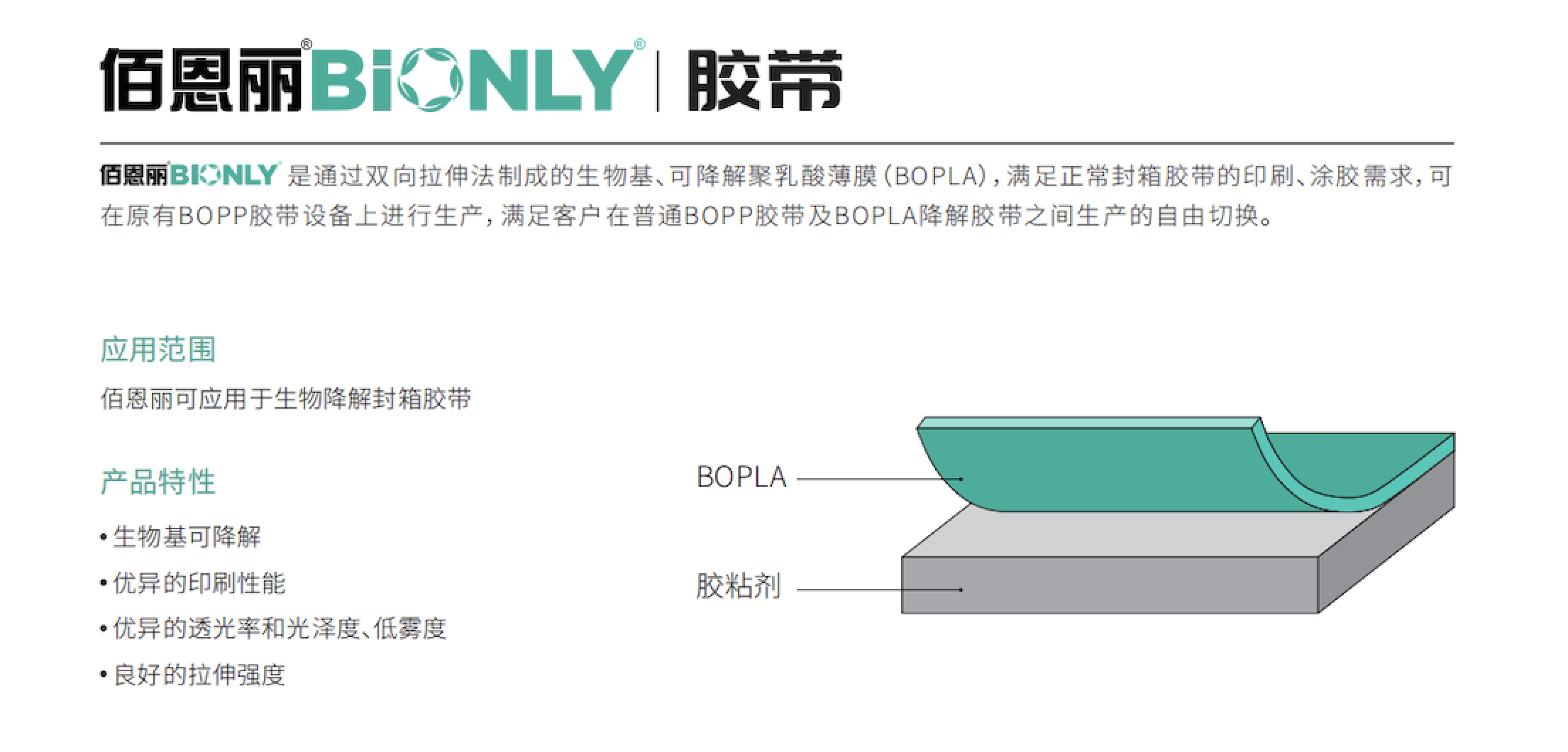 佰恩麗®BiONLY®具有優良的力學性能,可以滿足封箱膠帶的拉伸強度要求,同時其還具有印刷適應性廣,適合環保水性油墨印刷,有很強的油墨附著力,對于封箱膠帶的上膠環節,BOPLA薄膜適用于環保水性膠水,無需另外做防水涂層,可在現有的BOPP膠帶設備上進行生產,提高設備利用率和生產效率,有效降低設備投資和社會資源浪費。