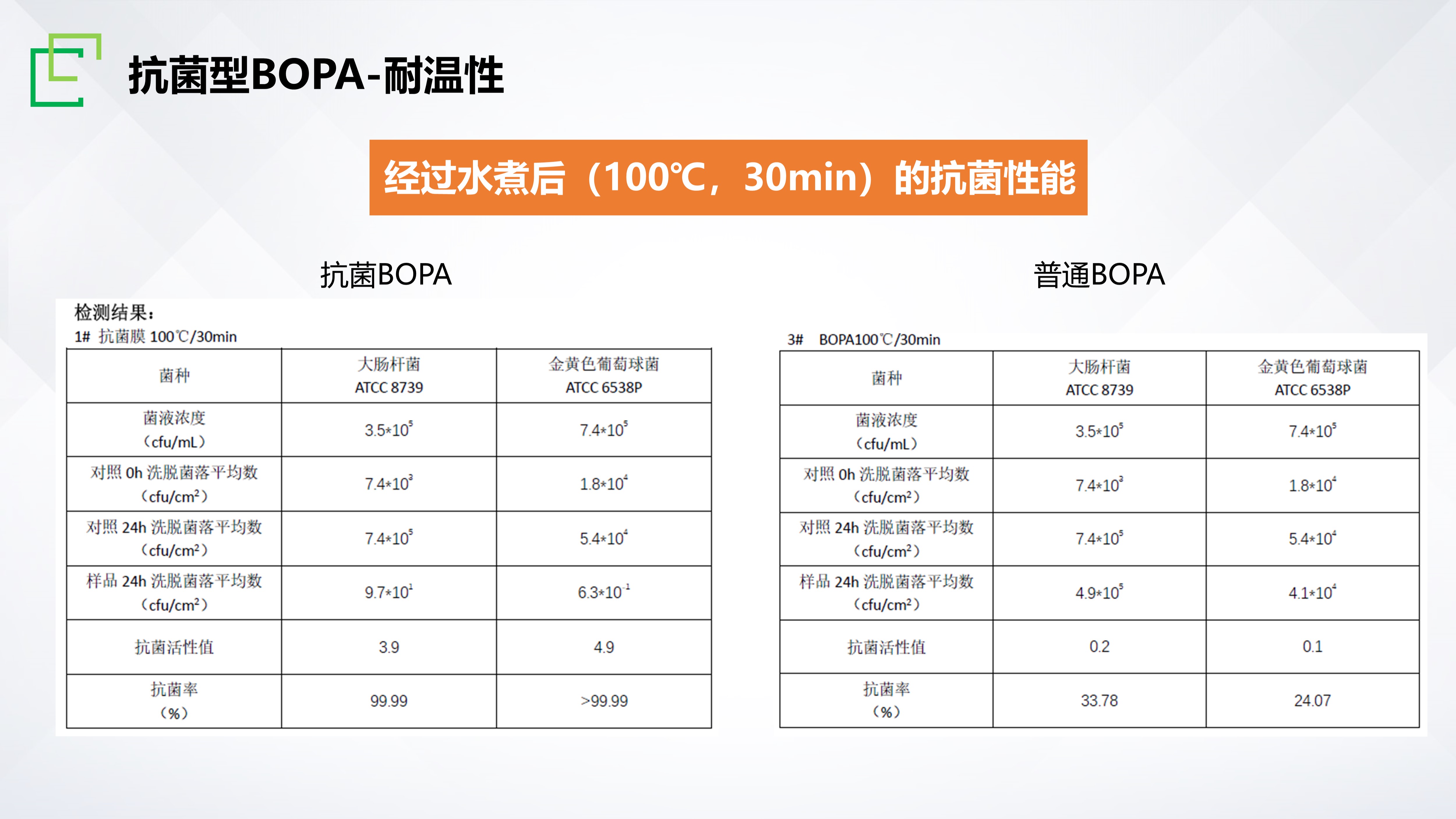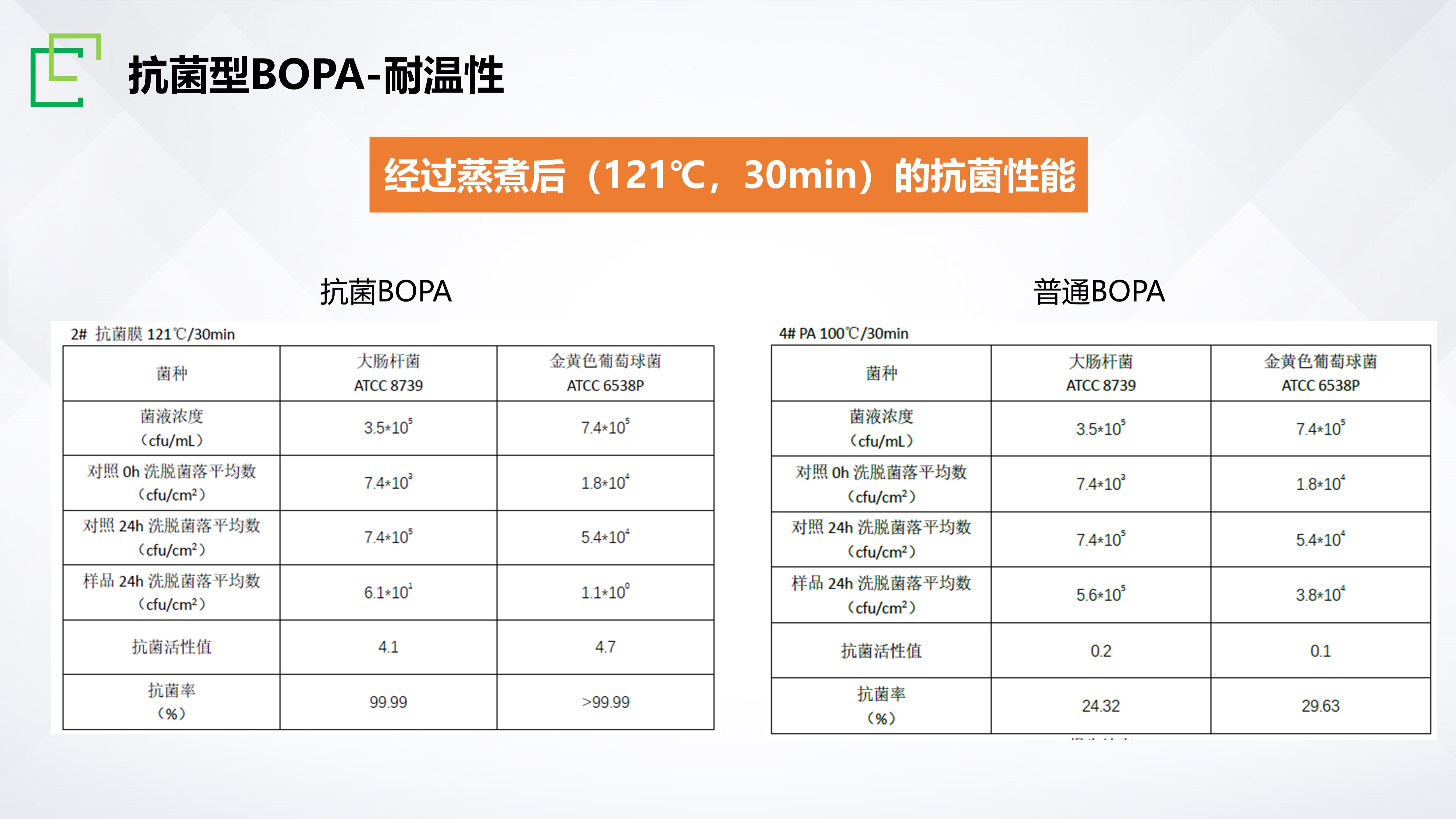 長塑矢量膜®APA抗菌型材料,是為應(yīng)對食品流通過程中的病原微生物污染而研發(fā)的一款新型功能性膜材,目前已通過國際權(quán)威檢測機(jī)構(gòu)SGS認(rèn)證,對常見革蘭陰性、陽性代表菌大腸桿菌和金黃葡萄球菌擁有優(yōu)異的抗菌性能,抗菌率≥99.9%。