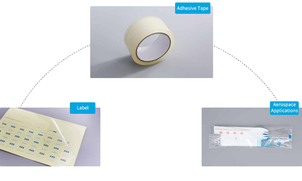 通過雙向拉伸法制成的生物基、可降解聚乳酸薄膜(BOPLA),滿足正常封箱膠帶的印刷、涂膠需求,可在原有BOPP膠帶設備上進行生產,滿足客戶在普通BOPP膠帶及BOPLA降解膠帶之間生產的自由切換。滿足標簽生產的印刷、涂膠需求,替代現有塑料不干膠標簽,可有效滿足終端品牌對于低碳、可降解標簽的需求。